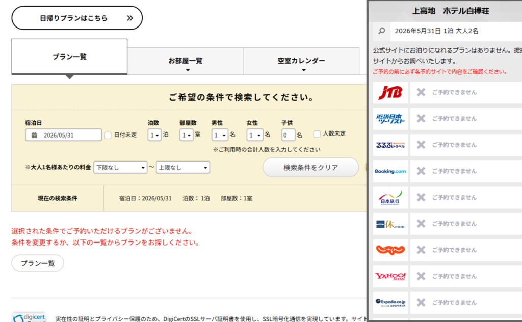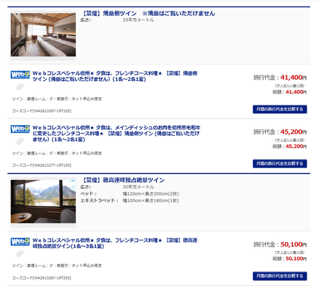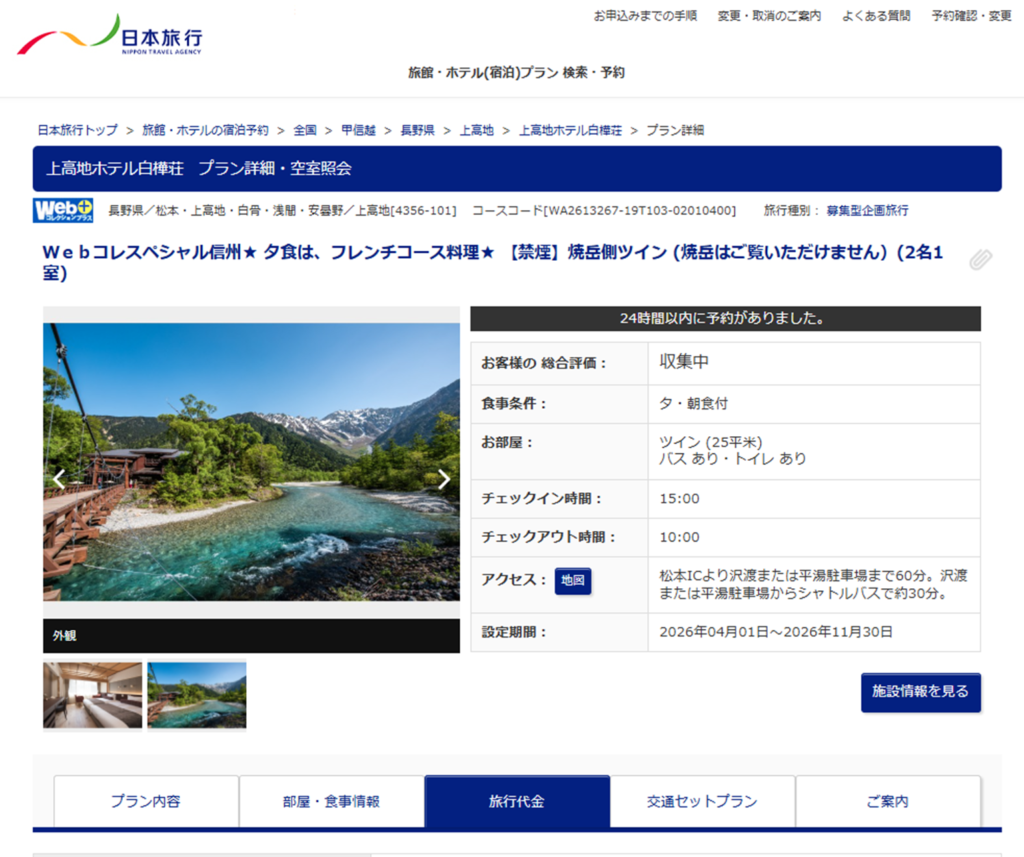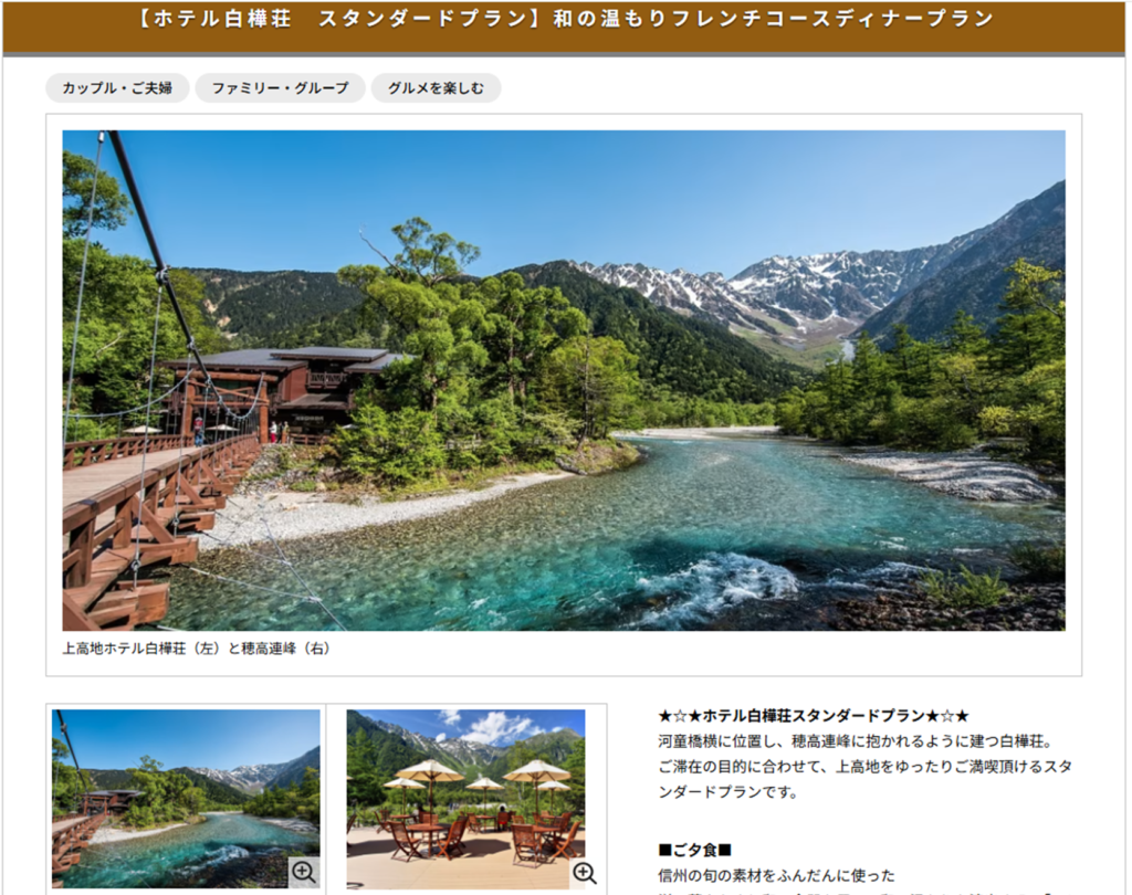 Google Mapのリンク紐づけミスなのだろうけど、怖いので、改めて日本旅行さんの公式サイトから上高地のホテルを検索したらちゃんとプランがでてきました。