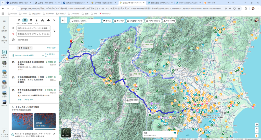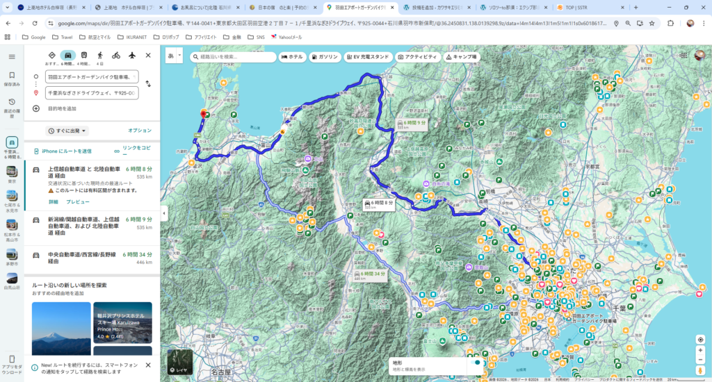東京からは中央道&北陸道経由で行くか、関越道&上信越経由で行くか、どちらもかかる時間的には同じくらいだが距離だけでいうと関越道からのほうが+100kmくらい伸びる。