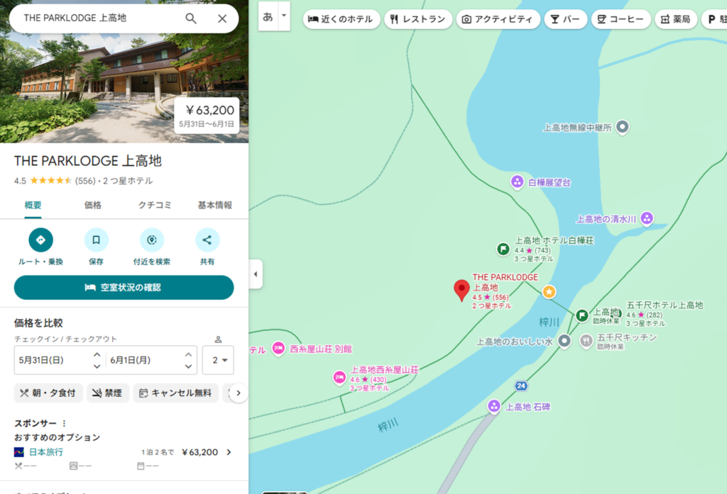 とGoogleMap上でポチポチしていると、目当てのホテル「上高地 ホテル白樺荘」は空き無しだったけど、その隣の「THE PARKLODGE 上高地」なら空室が出てきた。日本旅行さんで2人で63,200円。